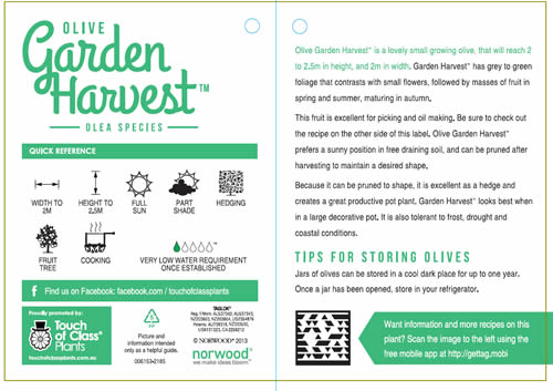 Olive Garden Harvest is a lovely small growing olive that will reach 2m to 2.5m in height and 2m in width. Garden Harvest has grey to green foliage that contrasts with small flowers, followed by masses of fruit in spring and summer, maturing in autumn. The fruit is excellent for picking and oil making.